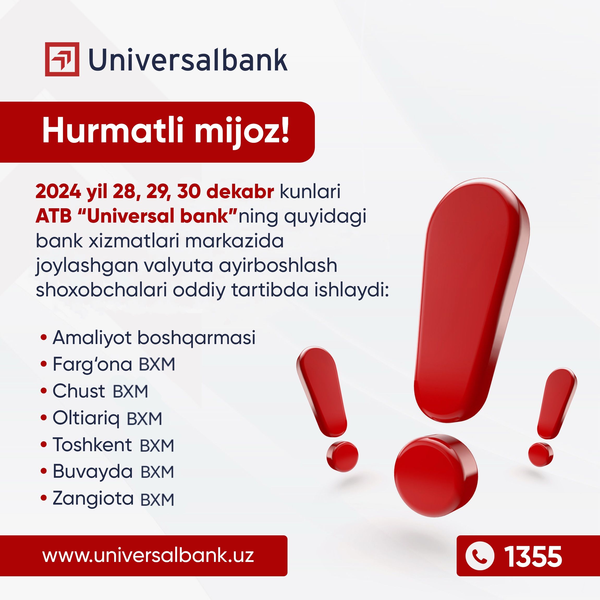 2024 yil 28, 29, 30 dekabr kunlari ATB “Universal bank”ning quyidagi bank xizmatlari markazida joylashgan valyuta ayirboshlash shoxobchalari oddiy tartibda ishlaydi: