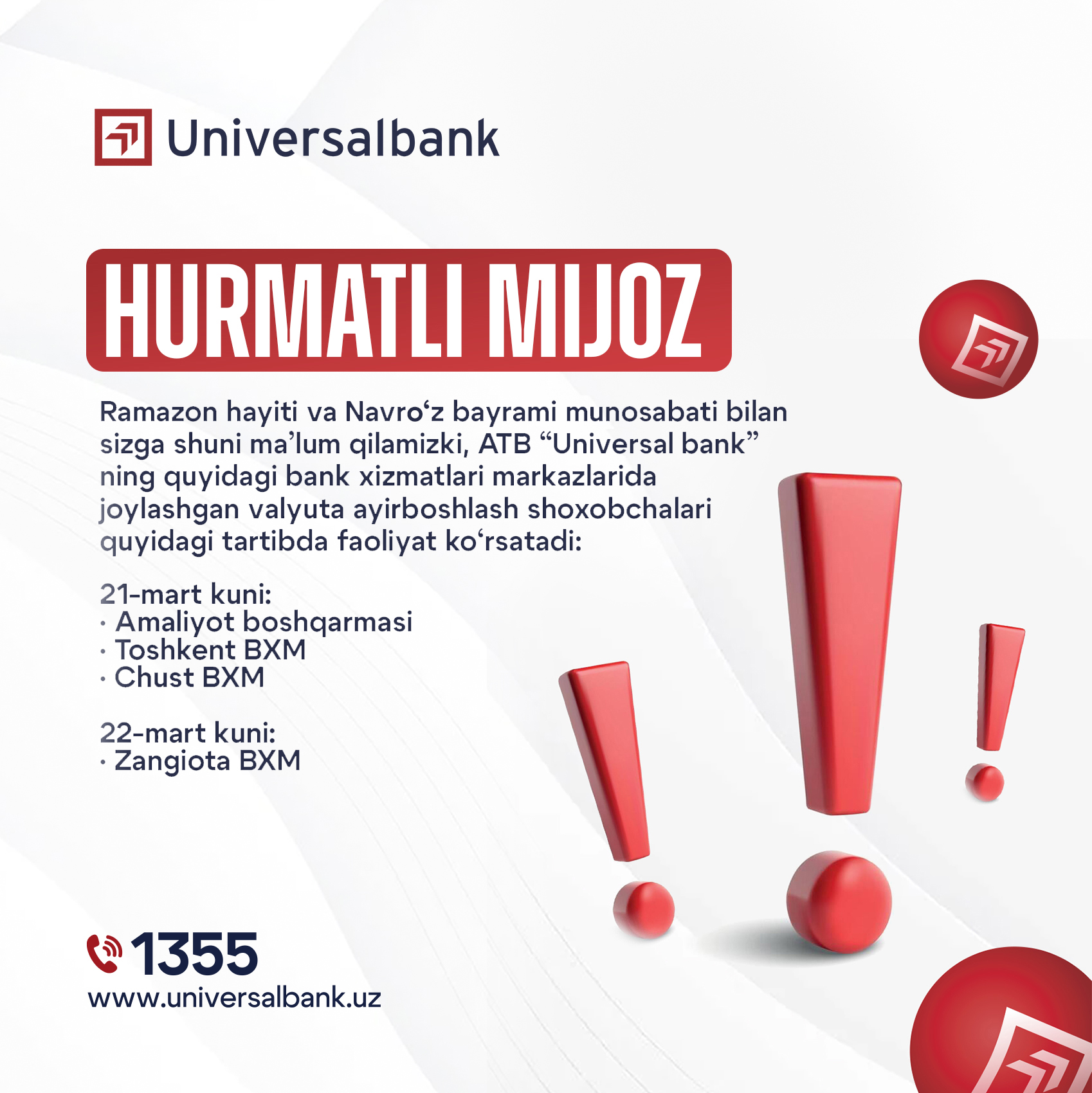 Ramazon hayiti va Navro‘z bayrami munosabati bilan sizga shuni ma’lum qilamizki, ATB “Universal bank”ning quyidagi bank xizmatlari markazlarida joylashgan valyuta ayirboshlash shoxobchalari quyidagi tartibda faoliyat ko‘rsatadi: